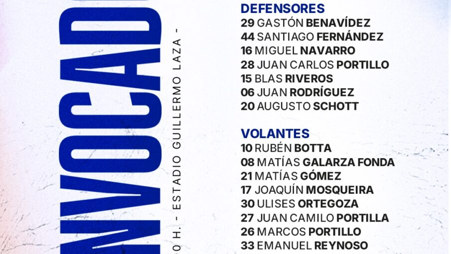Luego de la práctica de este jueves, el cuerpo técnico encabezado por Alexander Medina, dispuso que 23 jugadores concentren a la espera del partido ante el Malevo. Respecto a la última convocatoria, se suma a la nómina Matías Gómez. Por otro lado, no integran la lista de jugadores concentrados Matías Alejandro Galarza ni Sebastián Palacios.
