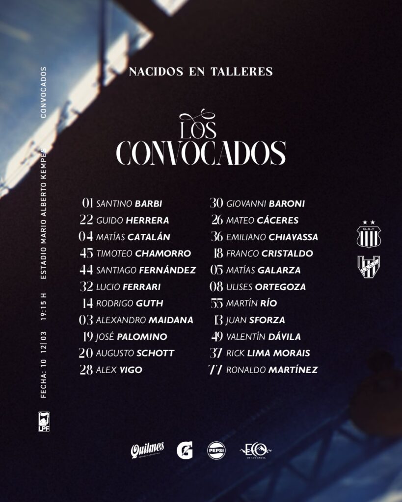 A través de sus canales oficiales, Talleres dio a conocer la nómina de convocados por Carlos Tevez.