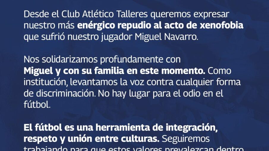 “Desde el Club Atlético Talleres queremos expresar nuestro más enérgico repudio al acto de xenofobia que sufrió nuestro jugador Miguel Navarro. Nos solidarizamos profundamente con Miguel y con su familia en este momento. Como institución, levantamos la voz contra cualquier forma de discriminación. NO hay lugar para el odio en el fútbol. El fútbol es una herramienta de integración, respeto y unión entre culturas. Seguiremos trabajando para que estos valores prevalezcan dentro y fuera de la cancha. Miguel estamos orgullosos de vos y tus orígenes, todo Talleres te acompaña”.